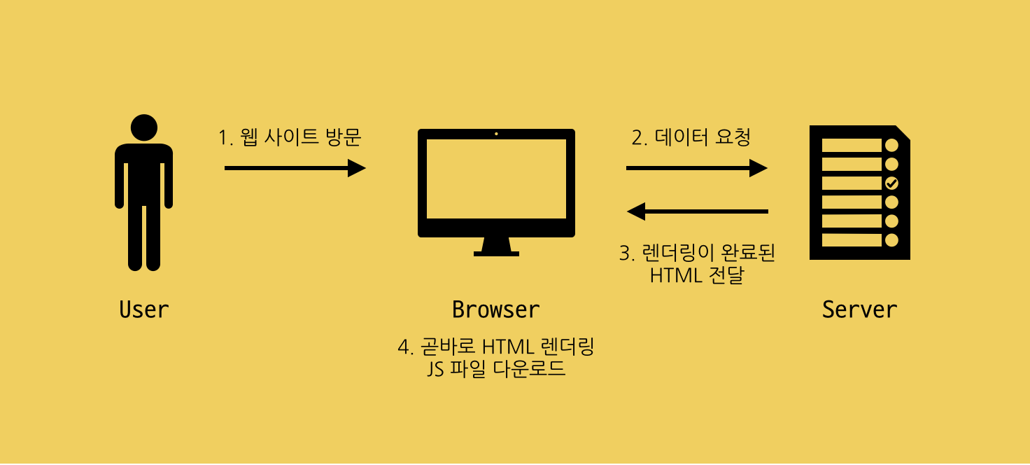 서버 사이드 렌더링(SSR)이란, UI 로직이 담긴 HTML 파일을 서버 측에서 렌더링하는 방식을 말합니다. 서버에서 렌더링이 완료된 HTML 파일을 전달받기 때문에 사용자는 곧바로 웹 사이트를 볼 수 있습니다. 그러나 사용자와의 인터렉션을 요구하는 자바스크립트 파일이 브라우저상에 다운로드되기 전까지 사용자는 어떠한 행위도 수행할 수 없어, TTV(Time To View)와 TTI(Time To Interaction) 사이의 공백 시간이 존재하게 됩니다.