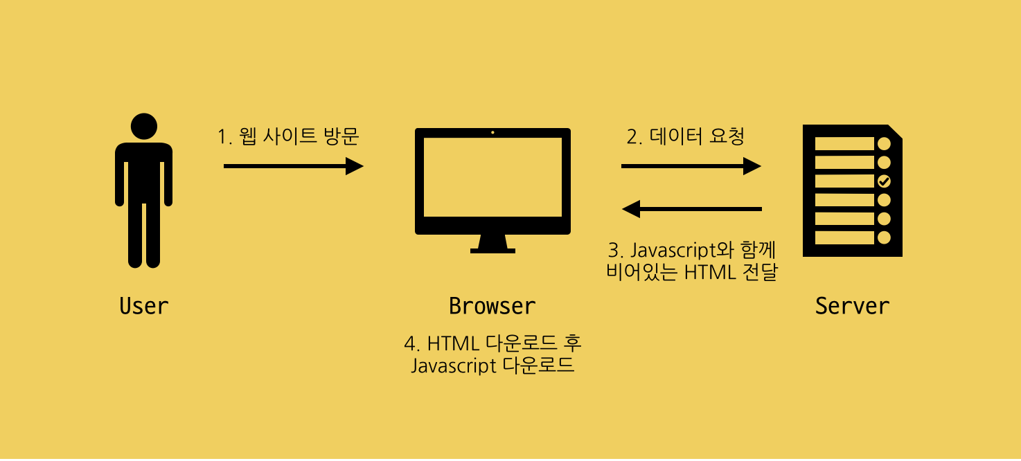 - 초기에는 비어있는 HTML 파일에 자바스크립트 파일을 적용하여 페이지를 렌더링하기 때문에 초기 로딩 속도가 느림