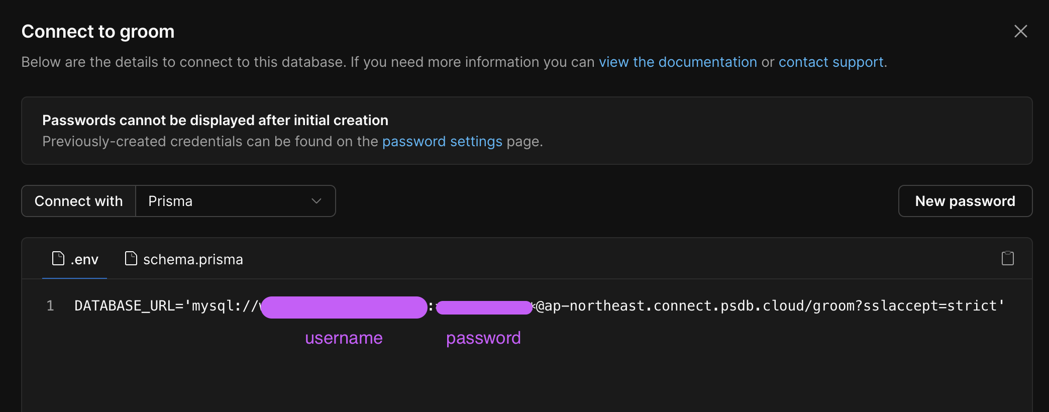 ์ฐ์ ๋ฐฐํฌํ DB์ ๋ด ํ๋ก์ ํธ๋ฅผ ์ฐ๊ฒฐํ๊ธฐ ์ํด์๋ DATABASE_URL์ ํ์์ ์ผ๋ก ์ถ๊ฐํด์ผ ํฉ๋๋ค. PlanetScale ์ฌ์ดํธ์์ ๋ฐฐํฌํ branch์ ์ ์ํ์ฌ connect ๋ฒํผ์ ๋๋ฅด๋ฉด ์์ ๊ฐ์ ํ์ ์ฐฝ์ด ๋จ๊ณ .env ํญ์์ DATABASE_URL ๊ฐ์ ํ์ธํ ์ ์๋๋ฐ, ์ด ๊ฐ์ ์ด๊ธฐ 1ํ๋ง password๊ฐ ๋ณด์ด๊ธฐ ๋๋ฌธ์ ์ ๋ณต์ฌํด ๋์๋ค๊ฐ ํ๊ฒฝ ๋ณ์๋ก ์ถ๊ฐํ๊ธธ ๋ฐ๋๋๋ค. ๋ง์ฝ ์ค์๋ก ์ฐฝ์ ๋ซ๊ฑฐ๋ ๋ณต์ฌํด ๋์ง ๋ชปํ๋ค๋ฉด ์ฐ์ธก ์ค์์ New password ๋ฒํผ์ ํด๋ฆญํ์ฌ ๋น๋ฐ๋ฒํธ๋ฅผ ์๋ก ๋ฐ๊ธ๋ฐ์ ์ ์์ต๋๋ค. :)